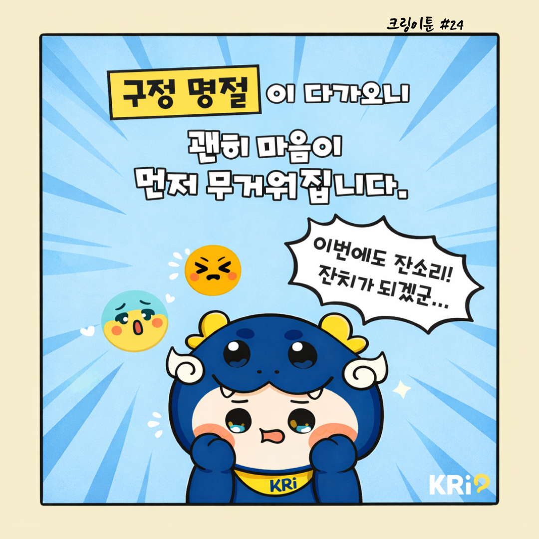 “요즘 뭐 하니?”“결혼은 언제?” 질문은 가볍다는데제 심장은 왜 철근 콘크리트죠…? 명절 대화가 부담인 건제가 예민해서가 아니라그냥… 너무 현실이라서요. “누구는 벌써…”이 말 나오면 자동 멘탈 로그아웃. 명절에는 유독‘남’이랑 저를 나란히 세워두더라고요. 근데요,저는 저 속도로 가는 중인데요…?집 가고 싶다 진짜 혹시 그 말들,다 나를 걱정해서 하는 걸까요? 그럴 수도 있죠.근데 말의 무게까지제가 다 짊어질 필요는 없잖아요. 오늘도 제 자존감은제가 지키겠습니다. 지금의 나도 충분합니다.진짜로요. 비교 기준은 ‘남’이 아니라‘어제의 나’니까. 이번 명절,나부터 챙기기 모드 ON ???? 당신의 속도는그대로 괜찮습니다. 코리아리서치는늘 당신 편입니다. 명절은 스쳐 가는 이벤트,내 인생은 장기전. 새해 복 많이 받으세요.그리고 무엇보다,나를 제일 먼저 응원해 주세요!
